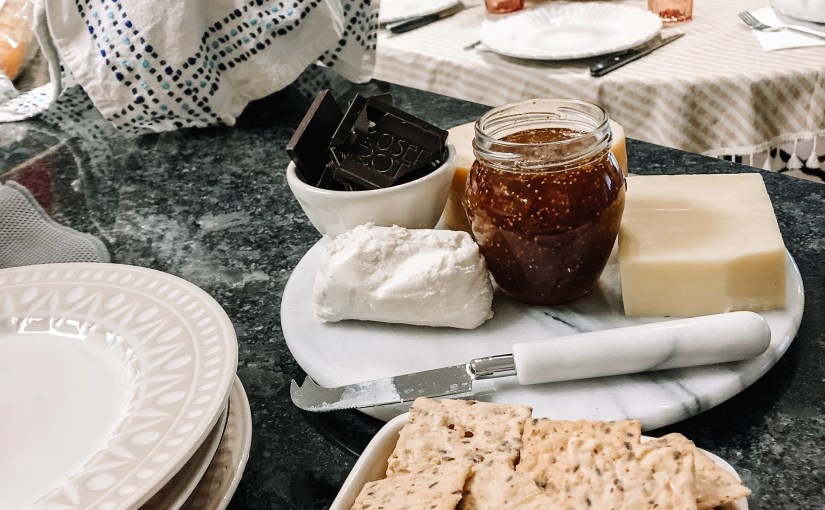 - Put out an appetizer. It can be as simple as cheese and crackers! Here’s the thing, it looks classy, it’s tasty, and now you don’t have to be stressed about guests starving as the food inevitably takes longer to cook! My cheese board essentials: yummy jam – this time an orange, fig; mild cheddar, smoked gouda, and goat cheese paired with my favorite, very dark chocolate. Nut-Thins were my gluten free cracker option.